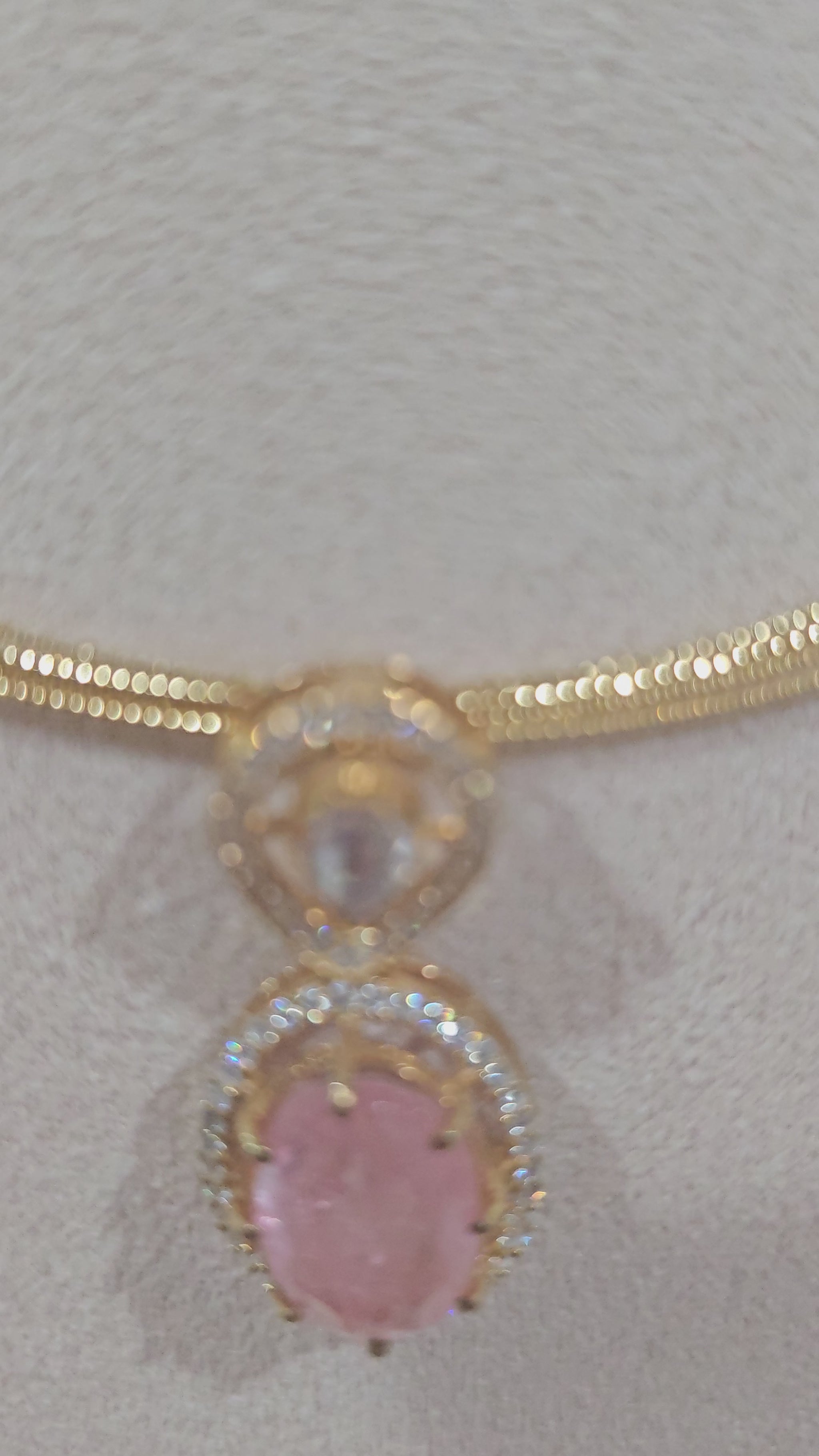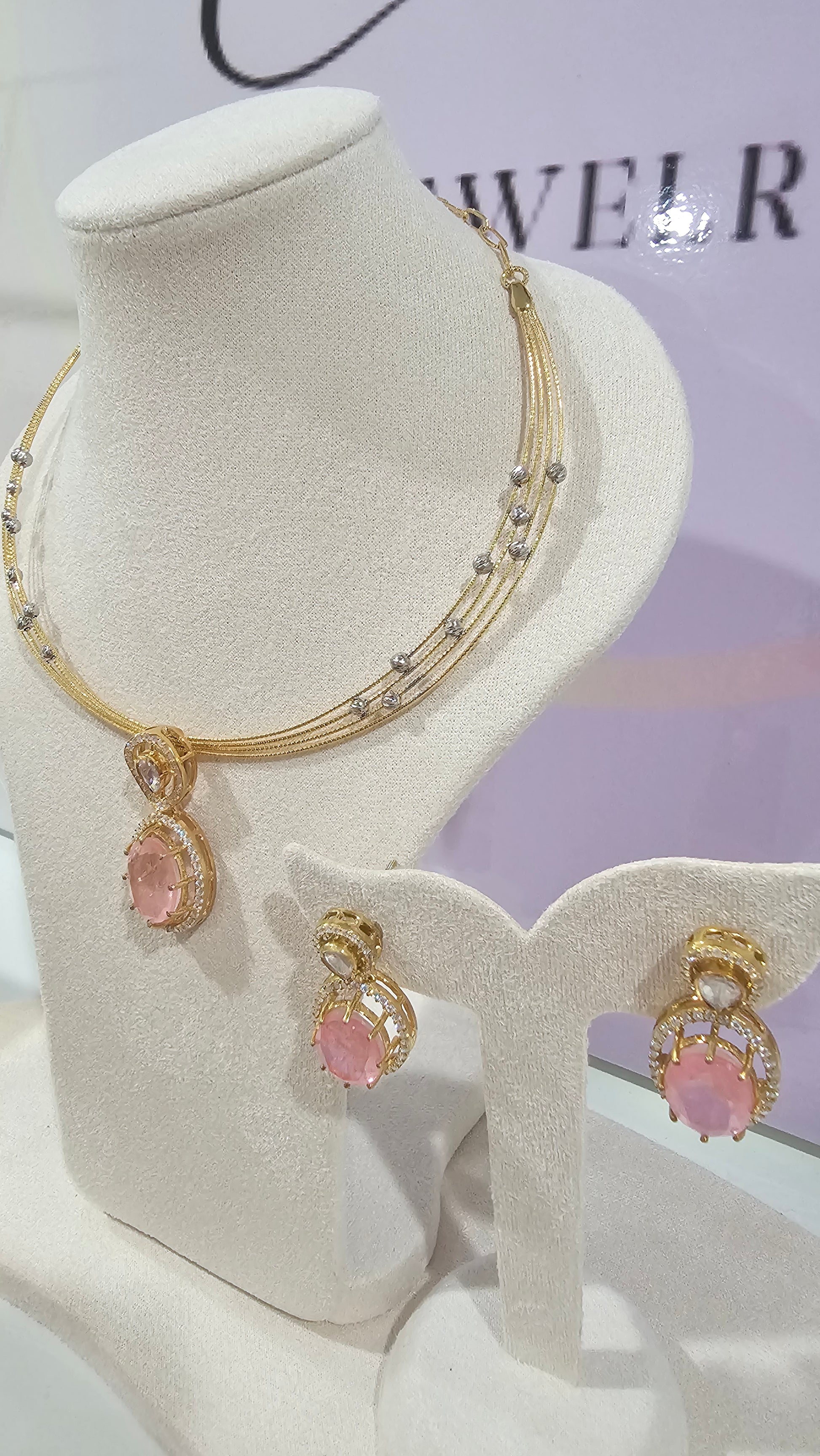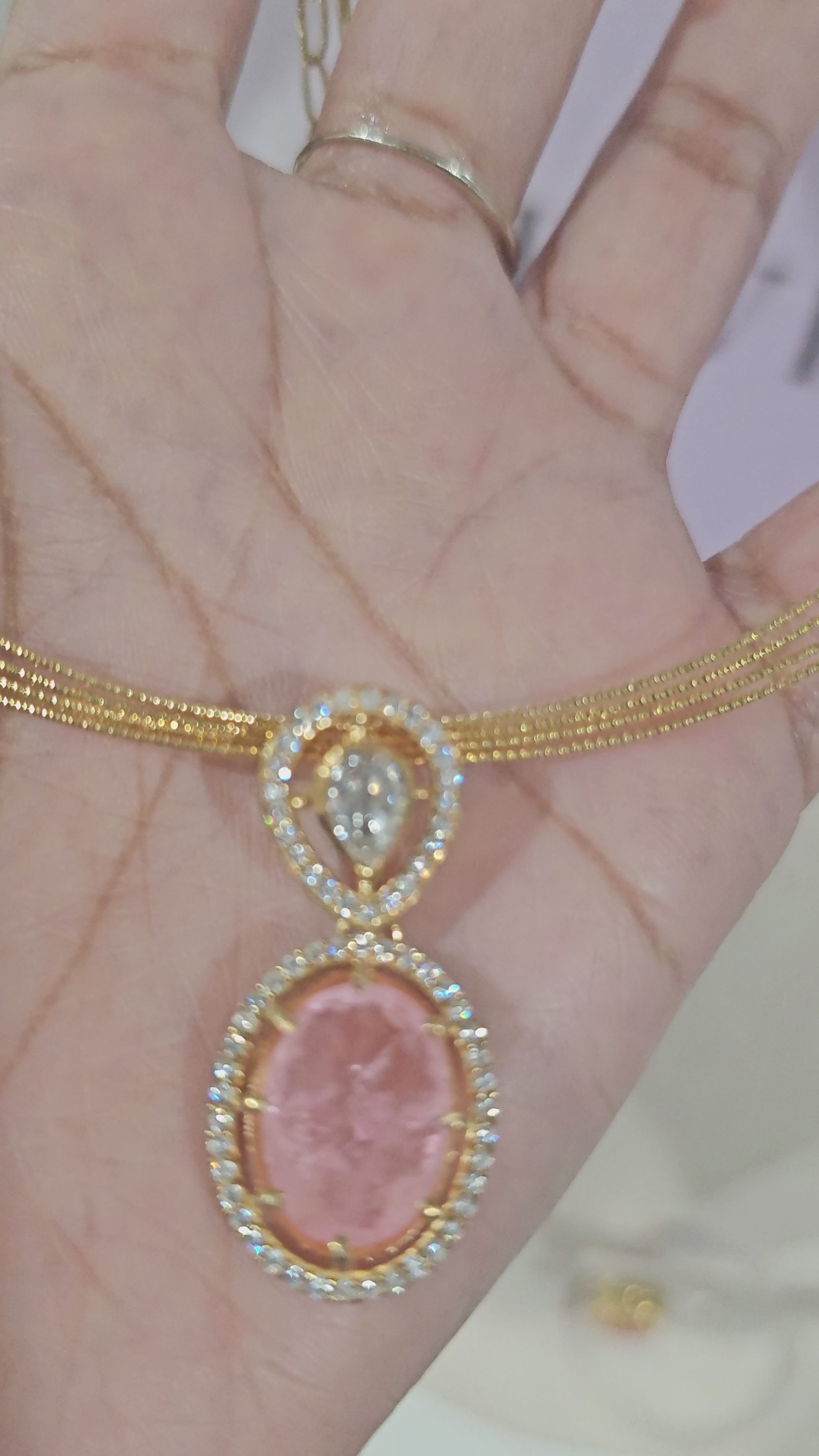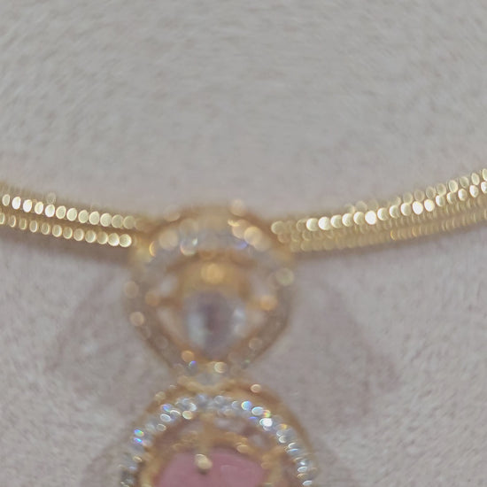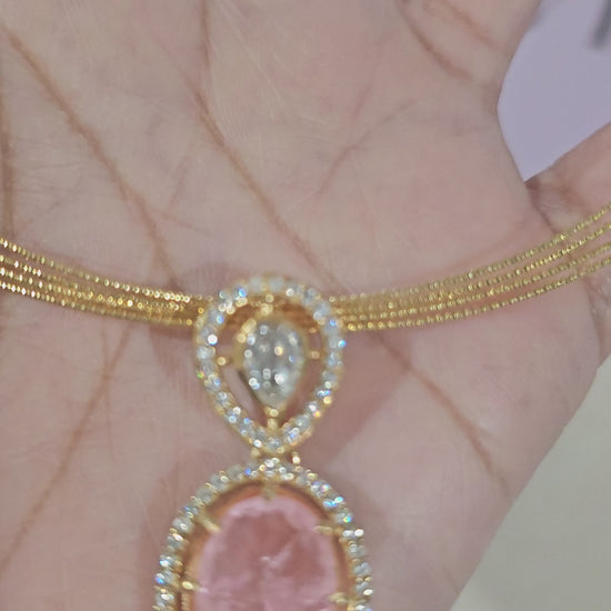 4 layer Hasli Necklace with Moissanite Polki Pendant & Earrings Set in 925 Silver , Peach color