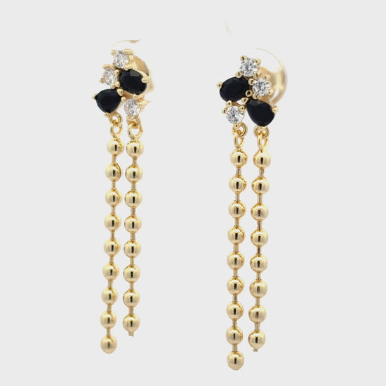 Beaded danglers in 925 silver , high polish gold plated with swarvoski crystals and stones in black, green, and hot pink
