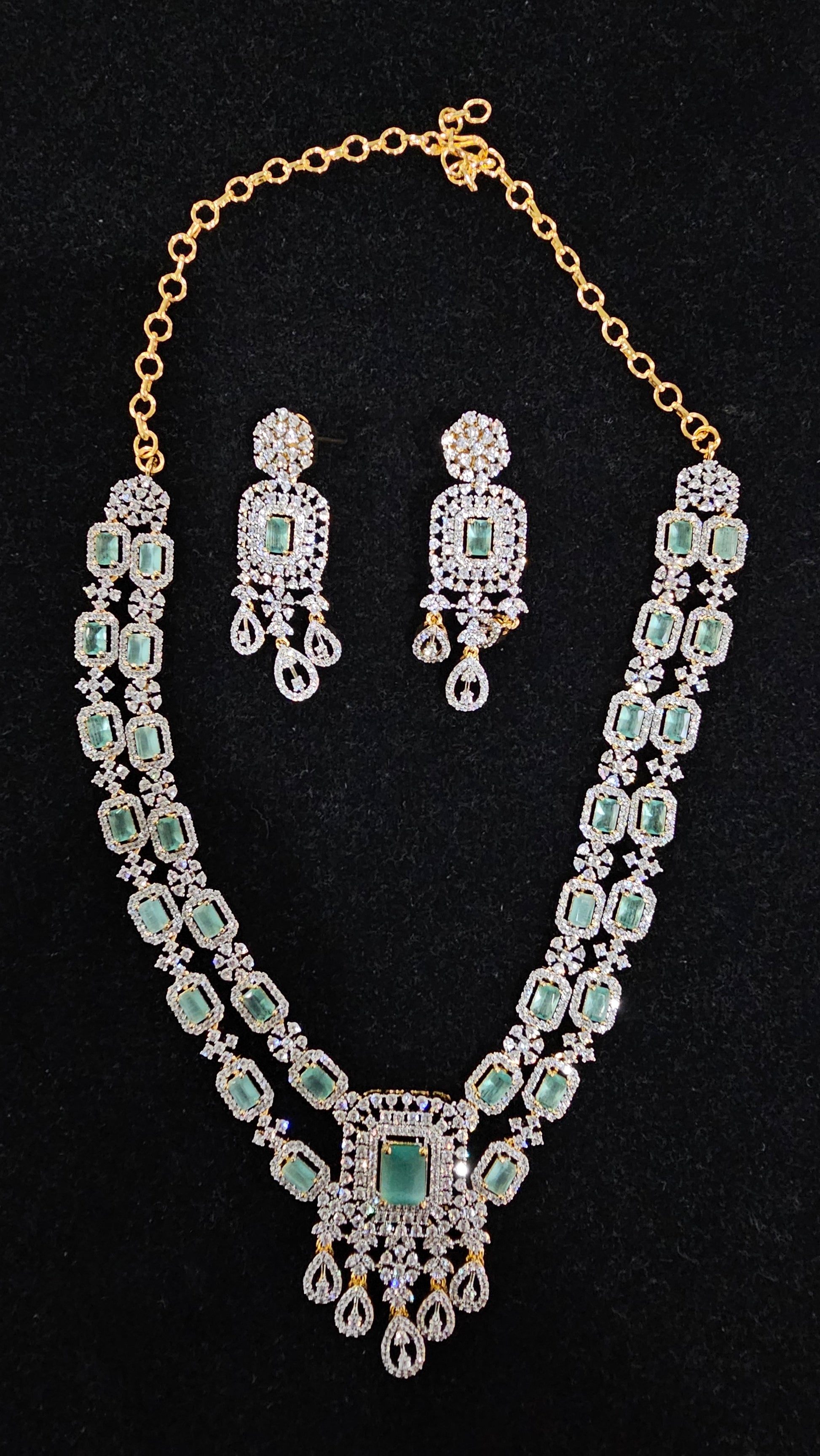 Mid-length CZ Necklace, Earrings set in Mint Green and Peach Colors