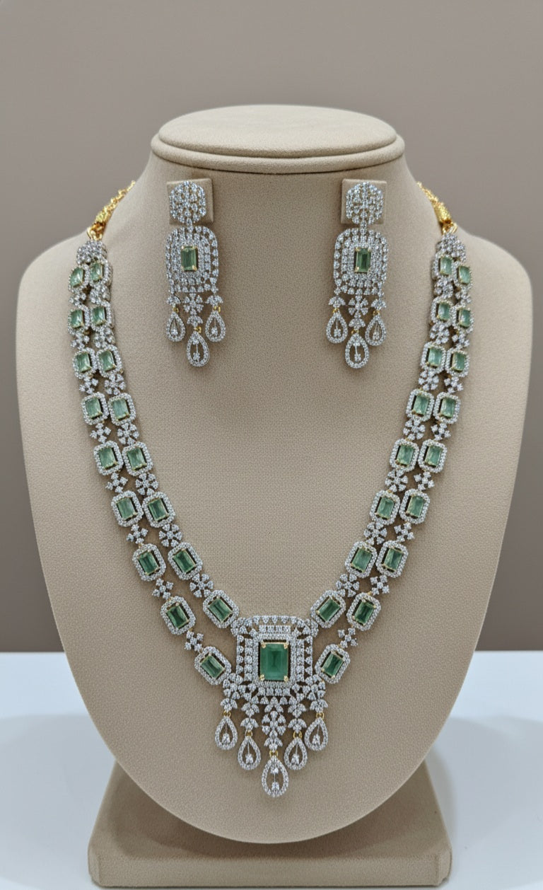 Mid length Necklace and Earrings in mint green and peach colors with CZs